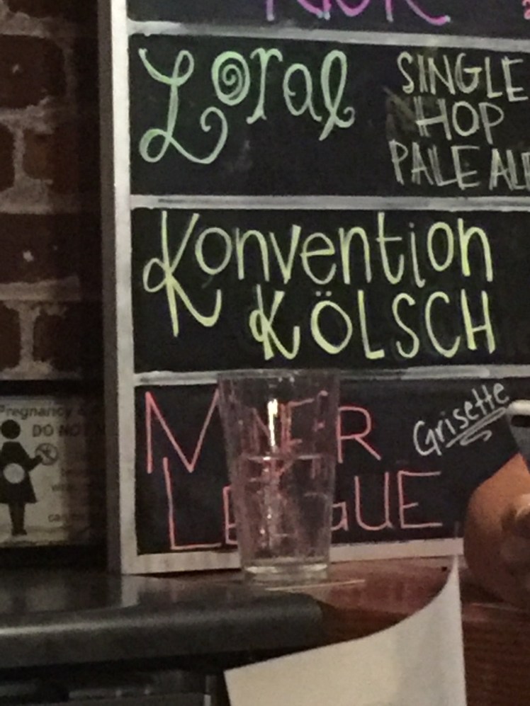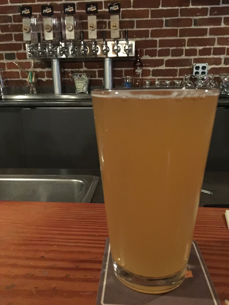 After a long day at work a stop in at Pints Brewing was well in order. The place is dimly lit and made mostly out of brick. The seating arrangements are a little strange, with some high and low spots and a large back area. I’m no stranger to Pints, so I took my usual spot at the bar and ordered the Konvention Kölsch, which I have never tasted before. At first I was a little shocked at the flavor. It’s rich and fruity, even a little tart, with a citrus aroma. It has hints of wheat and even a touch of peach. It has a pleasant golden haze.